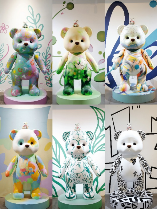艺术家们将代表着品牌的字母T和小熊、兔子、树叶等形象结合自己独特的艺术语言创作了本次的艺术品,每一只莉娜熊都承载着一位艺术家不同的艺术世界,所有观众都可以通过这些莉娜熊身上的色彩,看到一片独特的艺术花园。