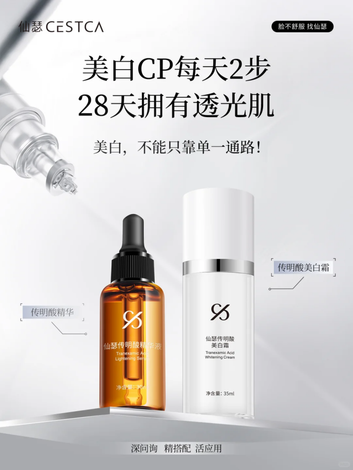 破解刺激难题,先从成分浓度的“精准把控”开始。仙瑟传明酸系列选择3%传明酸作为核心美白成分,这一浓度被业内视为“效能-刺激”的黄金平衡点。不同于高浓度传明酸可能引发的皮肤干燥、刺痛,3%浓度既能满足黑色素抑制的需求——通过阻断黑色素细胞信号传递,减少炎症后色沉的形成,又契合敏感肌对温和性的要求。《白皮书》中也提到,敏感肌适用的美白成分需兼顾“起效阈值”与“刺激阈值”,仙瑟3%传明酸的浓度设定,正是对这一需求的精准回应。