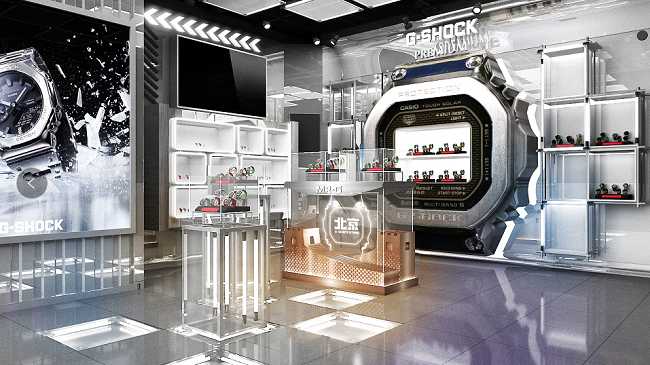 全新升级的G-SHOCK STORE采用冷峻的金属色搭配未来感十足的透明色作为店铺的主色调,身处历史悠久的帝都,却仿佛从未来穿越而来。店铺大门以G-SHOCK表头造型震撼呈现,穿越一扇穿越之门引领未来科技和潮流,代表着其带领潮流玩家探索未来的蓬勃野心。通过独树一帜的潮流风格以及众多高能腕表,不断挑战潮流边界。