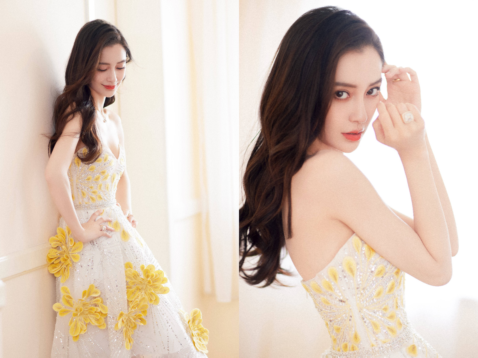 Angelababy加入综艺节目《心动的信号》第四季,最新造型以一套黎巴嫩品牌Georges Hobeika 2021春夏高订繁花纱裙为节目站台,平口剪裁完美衬托她的肩颈线条,且多个角度纤细毫无赘肉,几乎瘦成纸片人体态。Angelababy更大方以深V露出胸前阴影,增添火辣气息。视线向下看,遍布雪白纱裙的立体亮黄色花朵,宛如逼真绽放在其中,点缀宽松裙䙓顺势提升不少仙气,且透视裙下一双白皙美腿若隐若现,让人视线难以抽离。