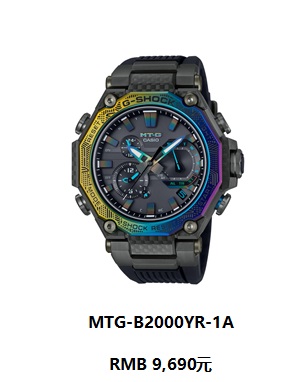 MTG-B2000YR-1A系列主要功能:六局电波*蓝牙连接*太阳能动力*电子表冠*世界时间(27个城市) *第二时间*秒表(1秒) *倒计时*每日闹铃*指针闪避功能*高亮度LED照明*节电功能*飞行模式*指针位置自动修正*全自动日历*防震*抗离心力*抗震*碳纤维核心防护构造*夜光*防反射涂层*人造蓝宝石玻璃镜面*200米防水