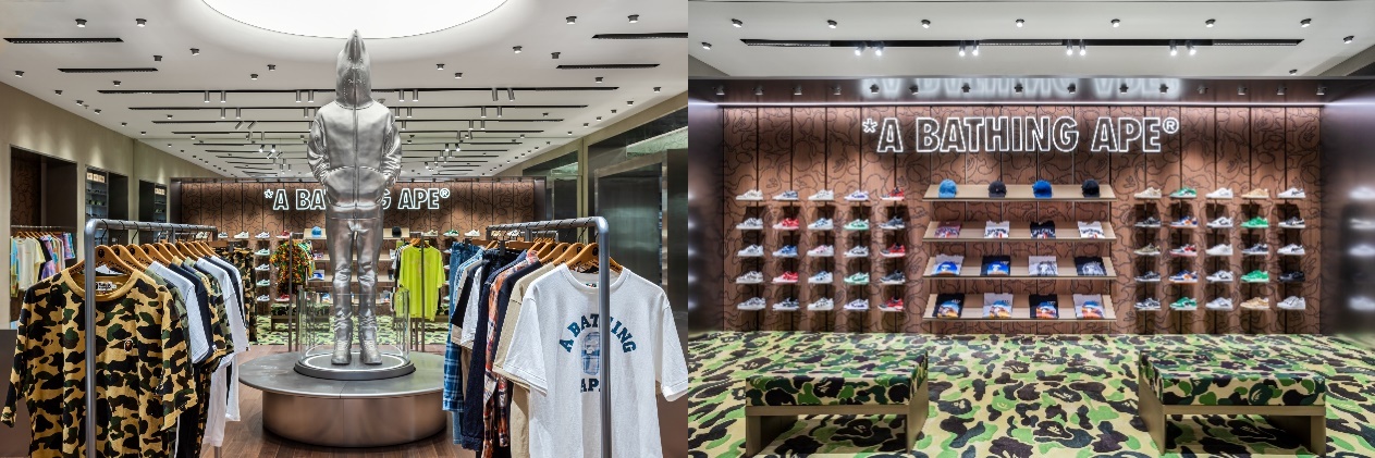 A BATHING APE®(BAPE®)在1993年诞生于日本里原宿的心脏地带,一直被视为日本街头时尚的指标,别树一帜的风格备受全球追捧。A BATHING APE®缔造了不少历久不衰的经典设计,如「APE HEAD」猿人头、「BAPE® CAMO」猿人迷彩、「BAPE STA™」标记、「SHARK HOODIE」鲨鱼帽衫和「BABY MILO®」图案等。伴随日益庞大的客群,品牌陆续推出Mr. BATHING APE®、AAPE、BAPY®和APEE by A BATHING APE女装系列及BABY MILO® STORE等副线品牌,开拓品牌在不同客层的业务持续增长。同时,A BATHING APE®不但是服装品牌,亦涉猎艺术展览、咖啡店、彩妆、香水、家具及玩具等生活方式范畴,将品牌融入粉丝生活的各个层面。目前,A BATHING APE®有逾40间专门店坐落于世界各地,包括日本、美国、英国、法国、中国、韩国、泰国及阿联酋等。