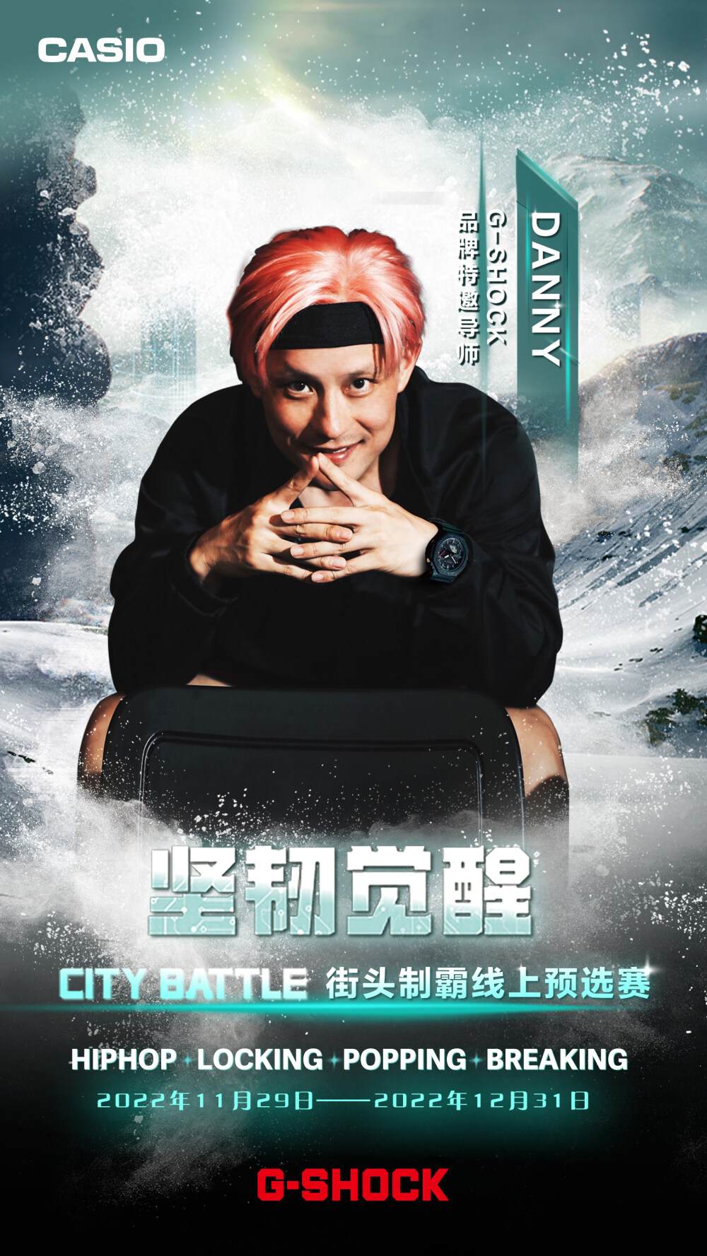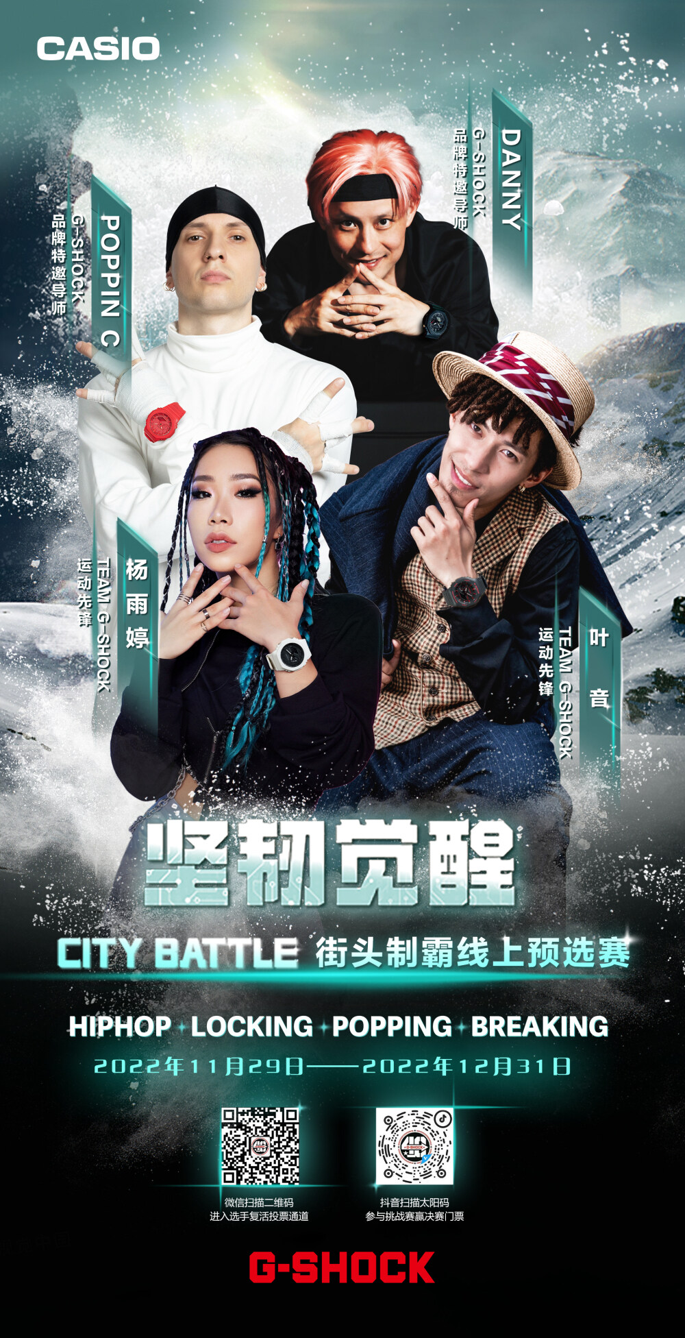 11月29日-12月31日,可通过G-SHOCK抖音官方(卡西欧手表)活动页参与线上挑战赛,用你的舞步彰示你的热爱!四位明星导师将根据线上参与者的热情演绎,选出8强出征CITY BATTLE总决赛。于此同时,线下对抗赛也将开启四场激烈对决,并由明星导师选出各场4强选手,组成线下16强。其中,在各场Battle中斩获冠军的选手将直接晋级决赛,而剩余的12名选手并非直接淘汰,而是仍将有机会获得最终晋级名额。12月27日-12月31日,G-SHOCK 将为12名选手开启复活投票通道,登陆「G-SHOCK WORLD」微信小程序为你喜爱的选手投票,就有机会见证他逆风翻盘!得票数最高的4名选手即复活成功,获得总决赛参赛资格,晋级名单将于12月31日在G-SHOCK官方账号公布!