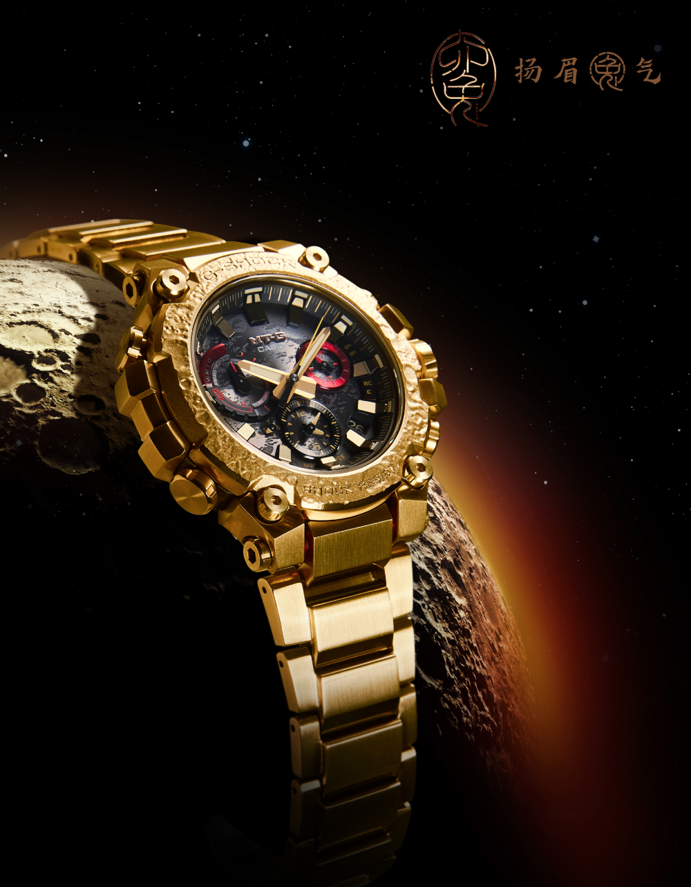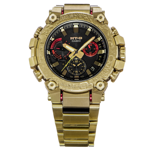 奢感金色在新年之际更添美好祈愿,将不凡融入日常。G-SHOCK MT-G兔年生肖款以金色IP涂层覆盖腕表表圈、表壳及表带,呈现不断精进的至臻工艺与坚韧精神,以高品质感为硬朗造型注入隽永格调。此外,腕表的两个小表盘还特别采用了红色,代表着月兔的红眼睛。在黑与金的映衬下,解锁灵动魅力。