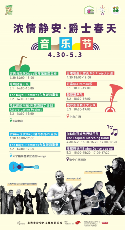 古典、流行、民族、嘻哈……多样的音乐形式在此融会贯通,并呈现一场涵盖音乐、舞蹈、艺术的春日狂欢,所有表演均可免费观看。Diago 竖琴弦乐四重奏的成员来自于不同的国家和地区,讲述超越大洲的音乐灵感。作品在全部原创的基础上,糅合了不同文化语境下的多元特质;MG Project乐团结合了来自世界各地的顶尖的音乐高手,不止电音才能蹦迪,当放克音乐遇上复古嘻哈,一场律动无限、动感醉人的派对夜;开散尔将拉丁、弗拉门戈与民族元素有机结合,将西方流行电子音乐与新疆传统音乐巧妙融入到音乐创作中。曾作为特邀喜宾参加CCTV“民歌中国”节目;一支来自上海本土的新蓝草乐队,将美国蓝草音乐风格、蒙古民歌和中国传统歌曲结合,并在不同程度上加入爵士、Funk,摇滚、世界音乐和当代流行音乐的元素……等等。另外,现场还穿插巡游、舞蹈、快闪等各类新鲜的玩法,等你来探索!无论你是爵士爱好者还是音乐小白,欢迎亲临现场听惬意的爵士乐,感受chill的假期时光。